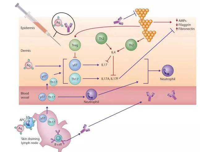 在過去的十年中,我們對AD這一復雜的異質性疾病的病因的認識有了很大的發(fā)展。“由外而內”和“由內而外”疾病過程的兩分法觀點已經被這樣一種認識所取代,即AD的特征是受損的皮膚屏障和異常的局部和系統(tǒng)免疫反應的相互作用。盡管Th2偏離炎癥長期以來被認為是疾病表達的中心,但TH22和TH17介導的炎癥現(xiàn)在也在不同程度上影響不同年齡和種族的患者。金黃色葡萄球菌現(xiàn)在也被認為是AD患者的另一個關鍵致病因素,包括它在放大Th2介導反應中的關鍵作用。S金葡菌利用了遺傳性功能缺失突變導致的聚絲蛋白表達減少,并通過TH2極化獲得,以及繼發(fā)于皮膚失調的抗菌肽水平降低。這些因素導致了特應性皮膚的高定植率。一旦建立,S金葡菌釋放多種毒力因子,包括絲氨酸蛋白酶、外毒素和溶血素,如酚溶性調節(jié)蛋白。這些都加劇了潛在的屏障功能障礙,并使內源性促炎因子路徑失調持續(xù)下去。 S金葡菌細胞壁成分,包括肽聚糖,放大TH2-驅動應答,導致增加粘附分子的表達(纖連蛋白和纖維蛋白原),減少抗菌肽的表達(人類β-防御素2和抗菌肽)和屏障蛋白(絲聚合蛋白和兜甲蛋白)。