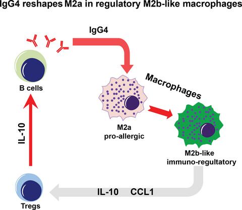 absorption, and in fluid form by protein L. Crosslinking of FcgRIIb by the IgG4 subclass redirects proallergic M2a macrophages to an M2b-like immunosuppressive phenotype. This suggests an interplay of macrophages with IgG4 in immune tolerance, likely relevant in allergen immunotherapy.