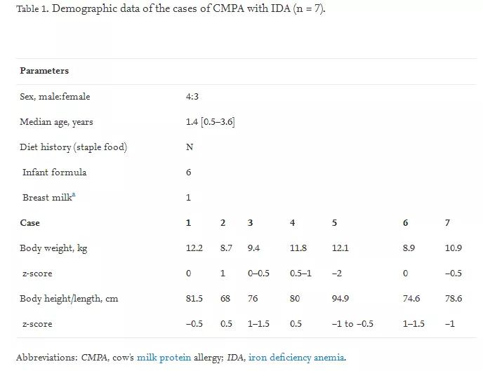 背景:牛奶蛋白過(guò)敏(CMPA)在兒童中的臨床表現(xiàn)各不相同。本回顧性研究旨在調(diào)查CMPA在兒童缺鐵性貧血(IDA)評(píng)估中的患病率和臨床表現(xiàn)。方法:對(duì)2005-2015年在臺(tái)灣國(guó)立成功大學(xué)醫(yī)院診斷為IDA(血清鐵蛋白<12 ng/mL)的4歲以下患者進(jìn)行回顧性分析。分析他們的臨床表現(xiàn)、實(shí)驗(yàn)室數(shù)據(jù)、內(nèi)鏡檢查結(jié)果和預(yù)后。結(jié)果:51例IDA患者中有7例(13.7%)有CMPA。臉色蒼白(100%)、發(fā)育不良(43%)和全身水腫(43%)是常見的特征。6人(86%)有低白蛋白血癥,4人(57%)大便隱血陽(yáng)性。在接受皮膚點(diǎn)刺試驗(yàn)的5例患者中,4例(80%)有陽(yáng)性結(jié)果。大多數(shù)結(jié)腸鏡檢查顯示為糜爛性、出血性結(jié)腸炎和淋巴樣增生,但沒(méi)有一例活檢顯示固有層嗜酸性粒細(xì)胞增多。所有患者在補(bǔ)充牛奶蛋白和鐵7個(gè)月后恢復(fù)正常。結(jié)論:對(duì)于未確診的IDA幼兒,應(yīng)考慮CMPA。去除牛奶中的過(guò)敏蛋白質(zhì)和補(bǔ)充鐵對(duì)恢復(fù)健康有幫助。