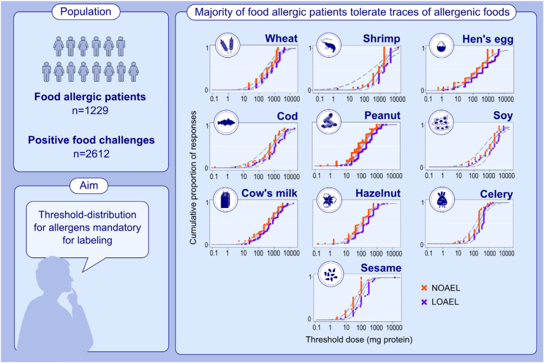 Background:It is mandatory to label food products with the 14 main allergens in the EU. Reasonable allergen labeling requires knowledge of population-based thresholds derived from food challenges. The aim of this study was to evaluate the threshold-distribution in clinically verified food allergic patients for allergens mandatory for labeling.