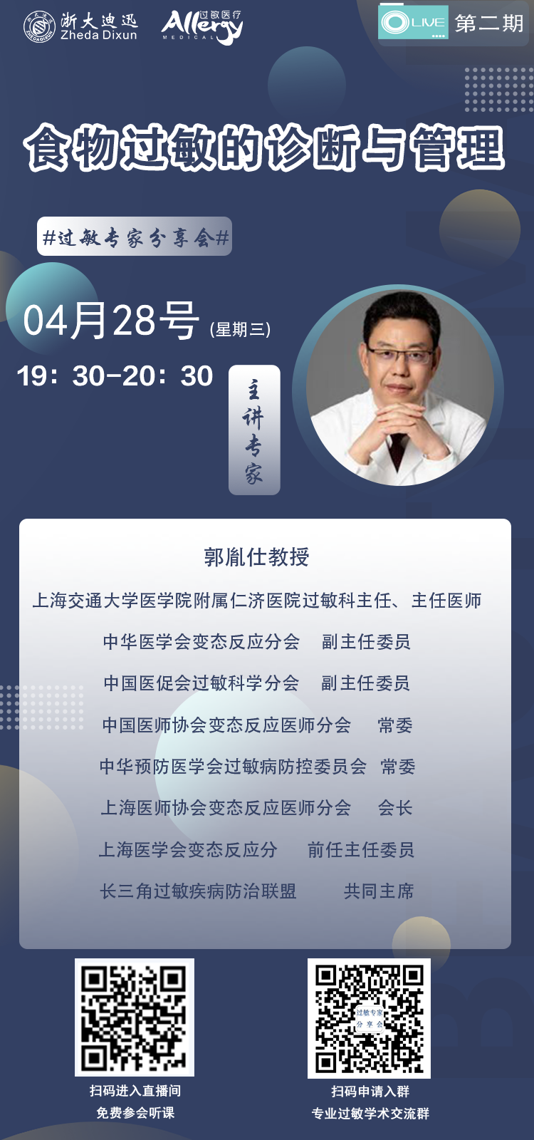 歡迎大家4月28日晚上19:30收看“食物過敏的診斷與管理”直播講座