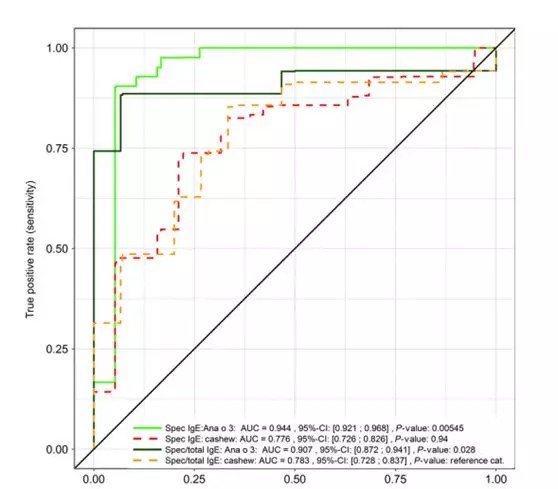 ① 使用特異性IgE進行2s蛋白的組分分析已被證明是診斷過程中的一個有價值的新選擇;② 共有61名患者被納入研究。42例對腰果過敏,19例耐受;③ Ana o 3比腰果特提取物能更好地區(qū)分過敏性和耐受性兒童;④ Ana o 3組分特異性IgE是診斷腰果過敏有價值的工具。