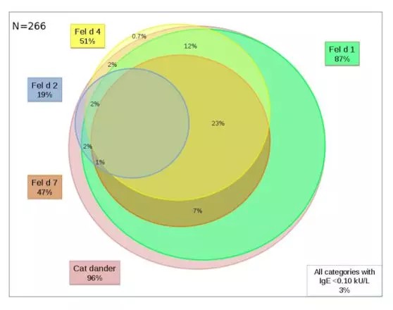 ① 貓毛敏感的分子模式因人而異,它們與哮喘患者炎癥的關(guān)系還沒有得到廣泛的研究;② 納入哮喘病人266人(10-35歲),其IgE對貓毛、狗毛和馬毛敏感(ImmunoCAP),分析IgE對貓毛過敏原成分Fel d1(分泌球蛋白)、Fel d2(血清白蛋白)、Fel d4、Fel d7(脂蛋白)的影響;③ IgE對Fel d2的水平與FeNO (p=0.012)和總IgE (p<0.001)有相關(guān);④IgE對于Fel d 1和貓毛提取的炎癥標記物無任何關(guān)聯(lián)(p = 0.23?0.51);⑤ 青年哮喘患者血清中IgE對脂蛋白(Fel d 4)和血清白蛋白(Fel d 2)的水平與2型生物標志物和總IgE含量相關(guān)。