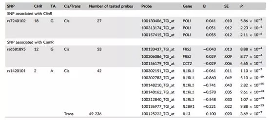 ?、?全基因組協(xié)會(huì)(GWA)的研究已經(jīng)明確與哮喘發(fā)生相關(guān)的基因,但是沒(méi)有研究哮喘緩解;② 臨床緩解(ClinR)的定義是,最近一年中沒(méi)有哮喘治療和喘息,最近3年內(nèi)無(wú)哮喘發(fā)作,完全緩解(ComR)在臨床緩解的條件基礎(chǔ)上,還必須保持正常肺功能和無(wú)支氣管高反應(yīng)性(BHR);③ 評(píng)估了2個(gè)獨(dú)立群體(總n = 456)中25個(gè)頂端單核苷酸多態(tài)性(SNPs)的復(fù)制情況,然后對(duì)肺組織和上皮細(xì)胞中4個(gè)復(fù)制的SNP進(jìn)行定量位點(diǎn)表達(dá)(eQTL)分析;④ 本研究確定了3個(gè)與完全哮喘緩解相關(guān)的SNP,其中2個(gè)SNP與FRS2、CCT、IL1RL1、IL18R1和IL13有生物學(xué)相關(guān)性;⑤ 本研究三個(gè)相關(guān)SNP分別為rs7240102、rs6581895和rs1420101。