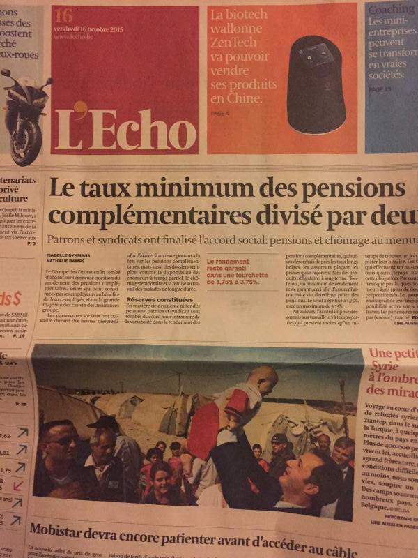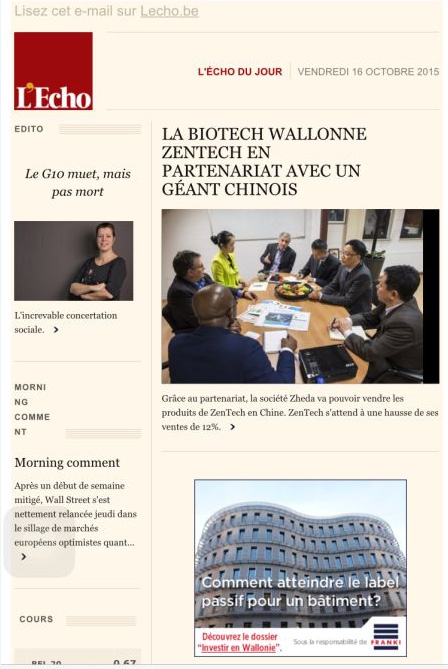 2015年10月15日在歐洲最大的經(jīng)濟報L'Echo(回聲報)頭版頭條進行新聞