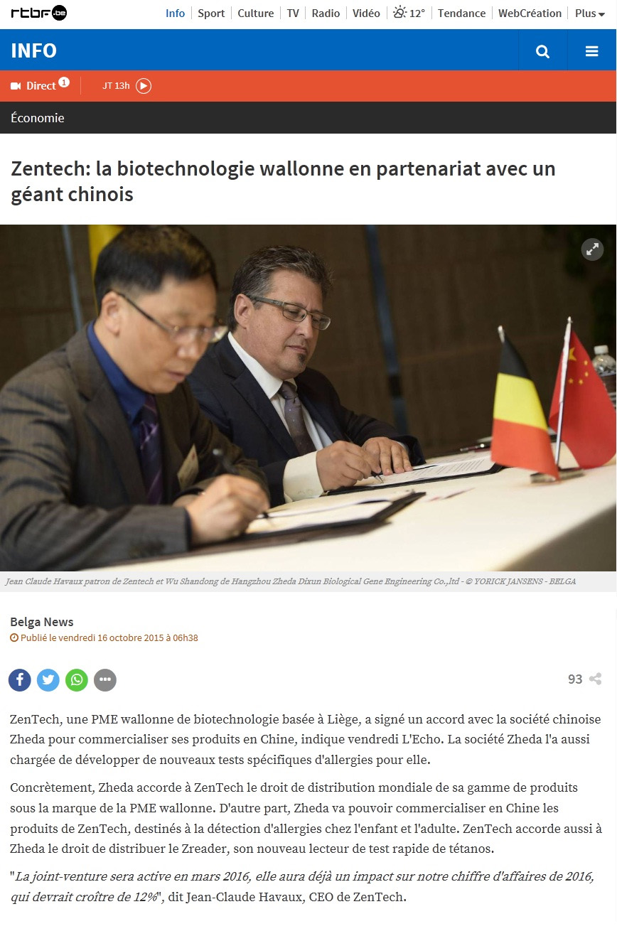 2015年10月16日比利時國家廣電(電視、廣播)公司報道了浙大迪迅與比利時Zentech S.A.合作